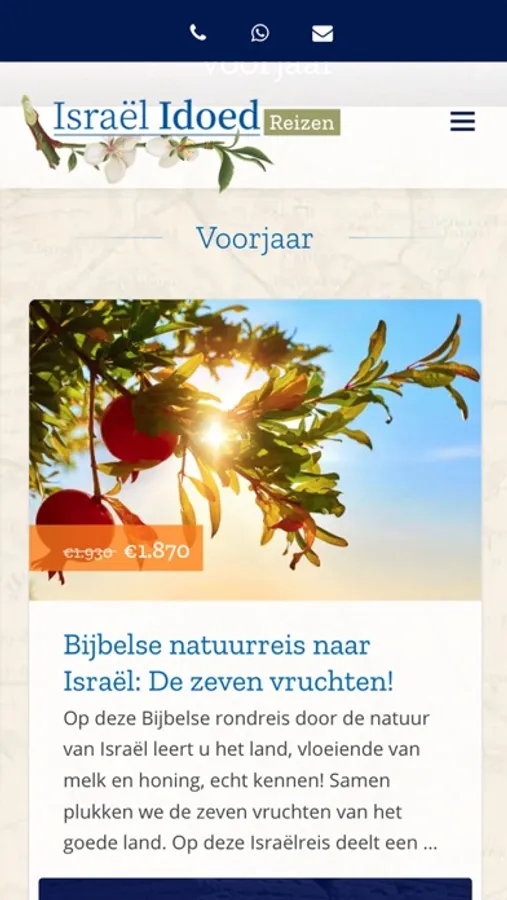 Heeft u het verlangen om naar het land van melk en honing te gaan? Wij ook! Ga met ons naar het schitterende Israël. Al reizend krijgt u een band met volk en land. Onze bijzondere reizen bevatten talloze unieke momenten die u nooit meer vergeet. In het Beloofde Land komt de Bijbel voor jong en oud tot leven. Dat is nog eens reizen met meerwaarde!
