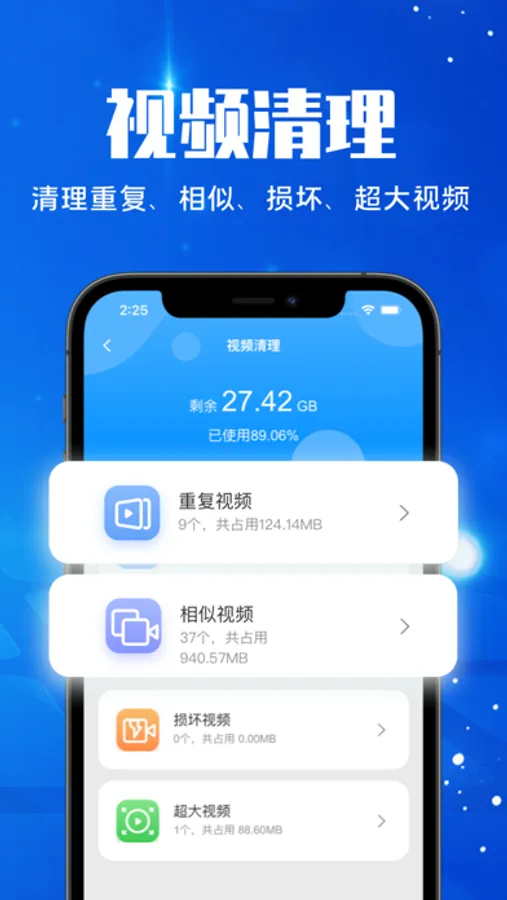 1、照片、视频扫描。智能扫描分析,帮助您快速找到模糊、重复的文件!
