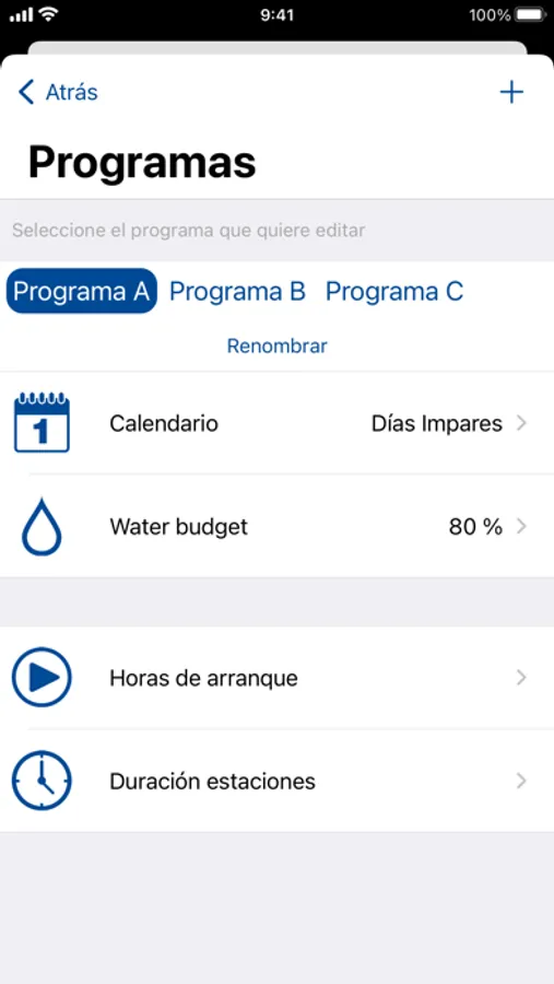 La aplicación permite la configuración y operación de diferentes sistemas de riego, así como el control de actuadores, programadores y sensores de humedad.