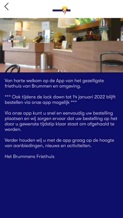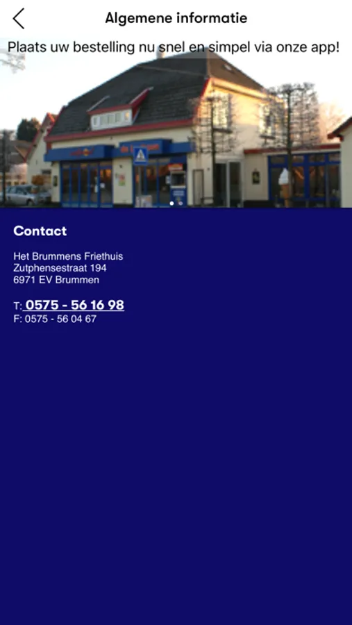 Bestel nu nóg sneller uw verse ambachtelijke patat, overheerlijke snacks, menu's, ijs en milkshakes bij het Brummens Friethuis!  Bestellen is heel simpel, u geeft uw bestelling op en u bepaalt wanneer uw het op wilt halen. Bovendien krijgt u korting als u via onze app bestelt!