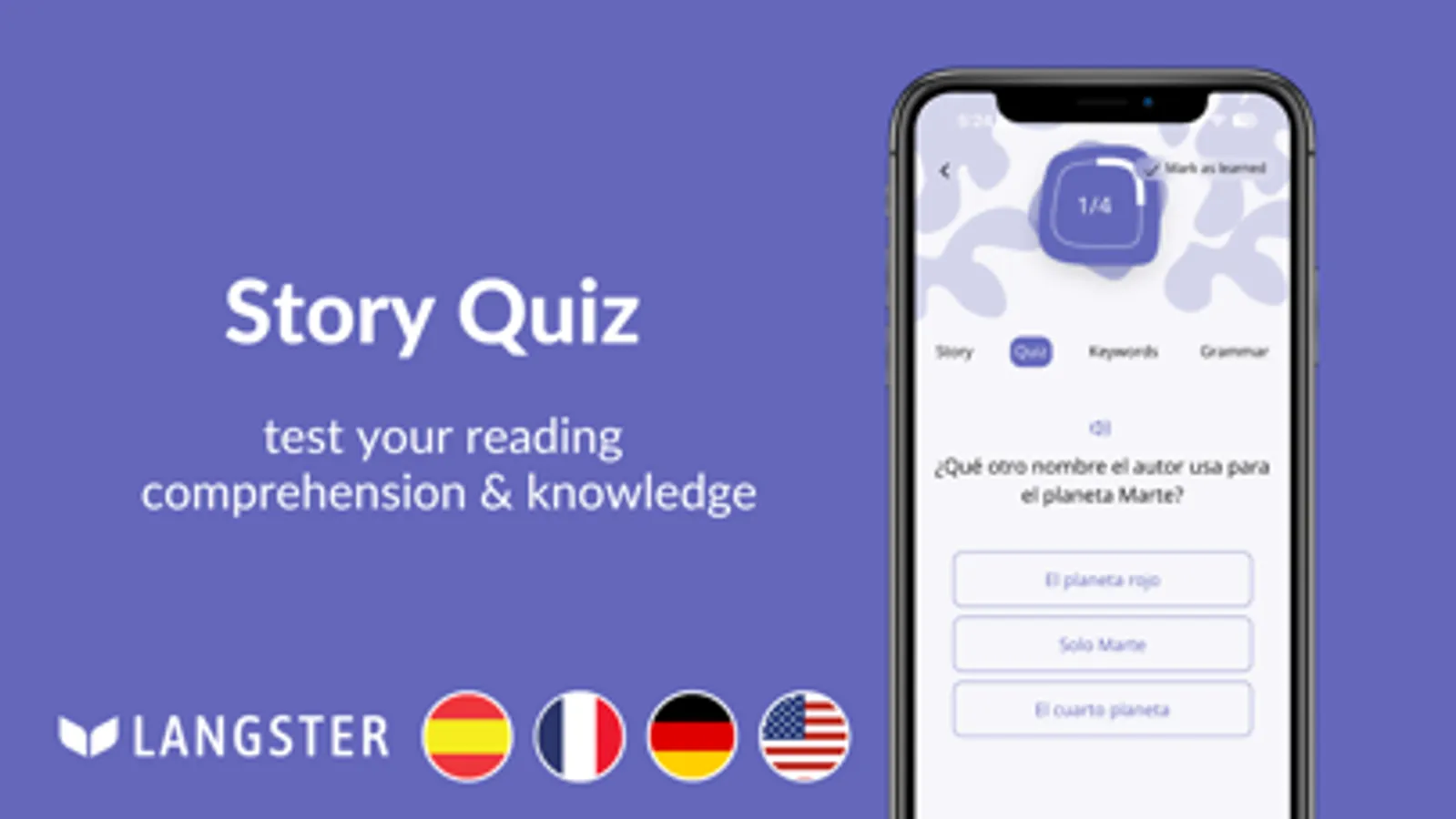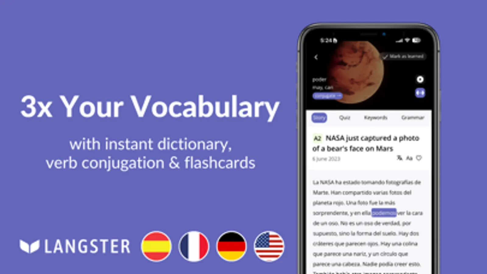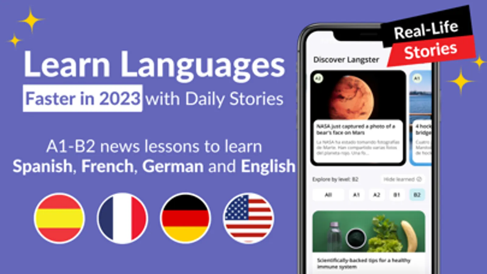 Langster is a language learning app with real-life news & stories from A1-B2 levels. We are the world's first CEFR-graded reader to help you learn French, German, Spanish, and English. Read and listen to news & stories anytime, anywhere – take 5 minutes a day to learn a foreign language!