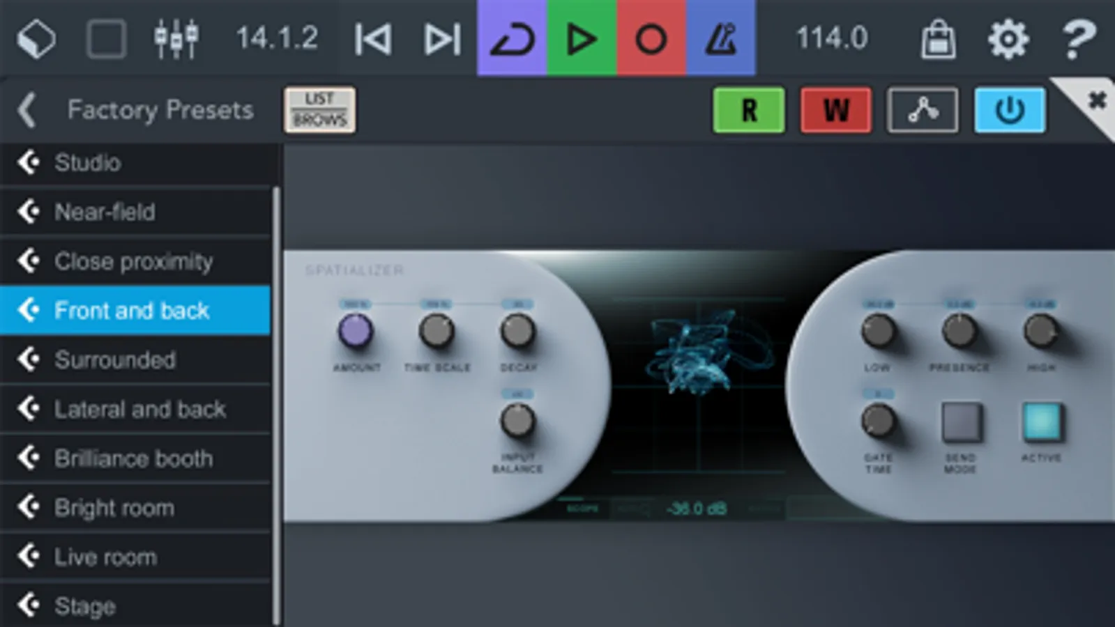 Due to its ability to provide subtle and focused responses, as well as good spectral density characteristics, Spatializer is also suited to be included in master bus effects chains.