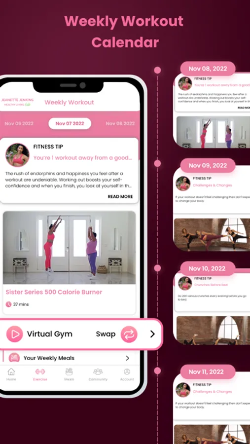 Workout in REAL-TIME with Jeanette guiding you through instructional classes with modifications for all fitness levels. All Live Workouts are saved to our Virtual Gym so you can do them anytime.