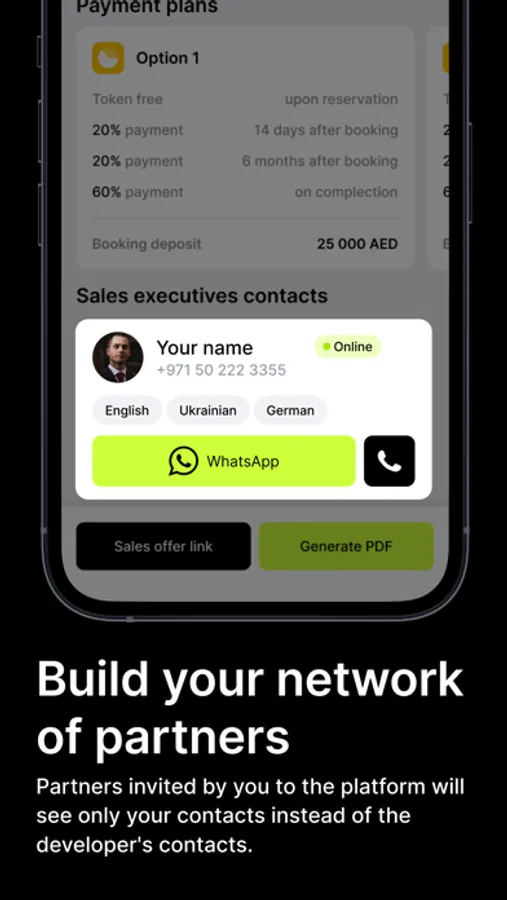 Build your network of partners. Partners invited by you to the platform will see only your contacts instead of the developer's contacts.