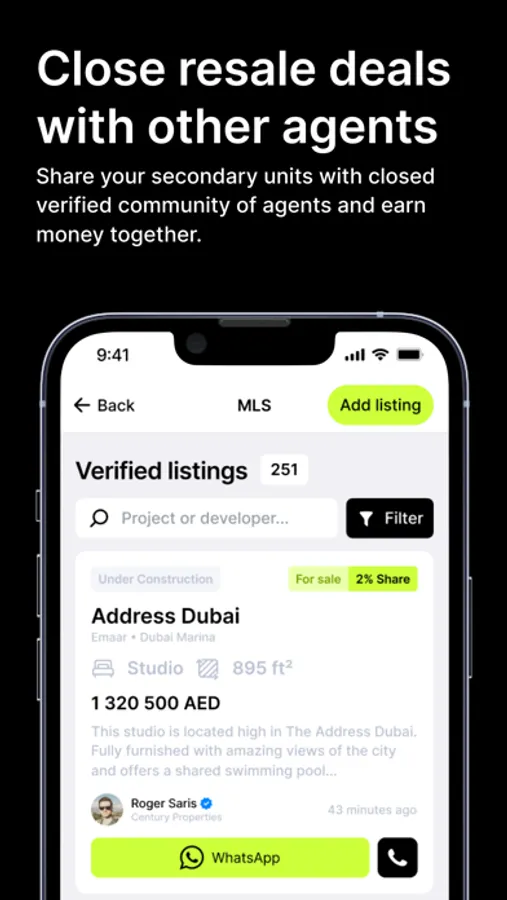 Close resale deals with other agents. Share your secondary units with a closed verified community of agents and earn money together.