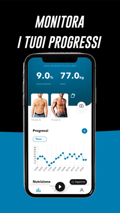 Avrai sempre sotto controllo la tua attività fisica: potrai visualizzare quali esercizi sono previsti nel tuo piano di allenamento, i tuoi progressi e come cambia il tuo fisico nel corso del tempo.