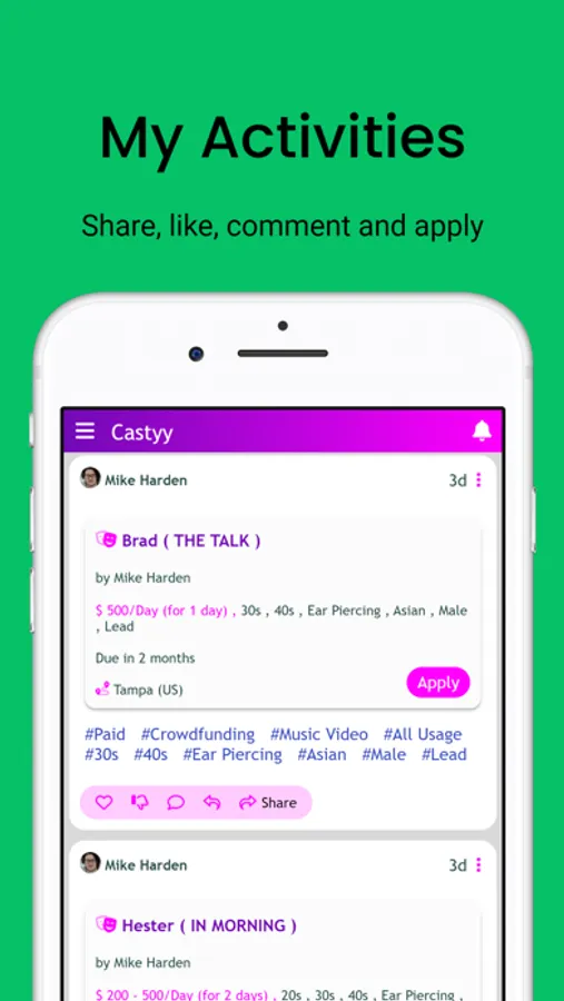 Castyy is Social Network for Entertainment Industry (Films/Music/Modeling/Advertising) Auditions, Jobs and News. This app provides way to post auditions/jobs related to entertainment industry. Actors/Models can search jobs, apply for jobs and submit auditions through the app. You can also review/edit job applicants and review their submitted auditions.