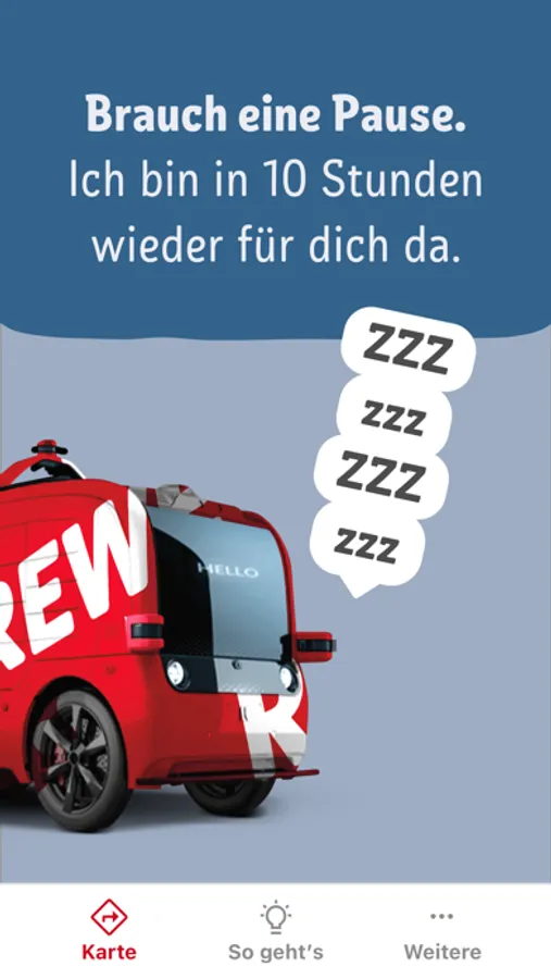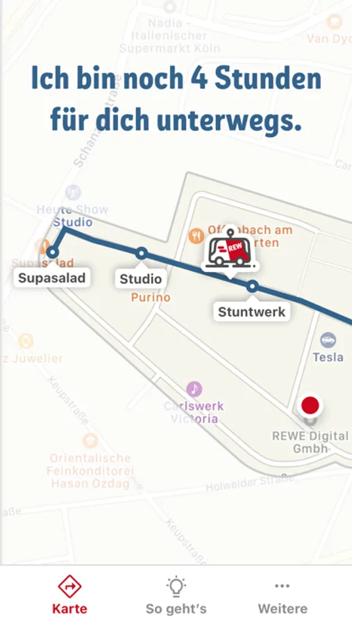 Mit der App kannst du immer verfolgen wo sich gerade das autonome Snack Mobil auf dem Carlswerk-Gelände in der Schanzenstraße 6-20 in Köln befindet.