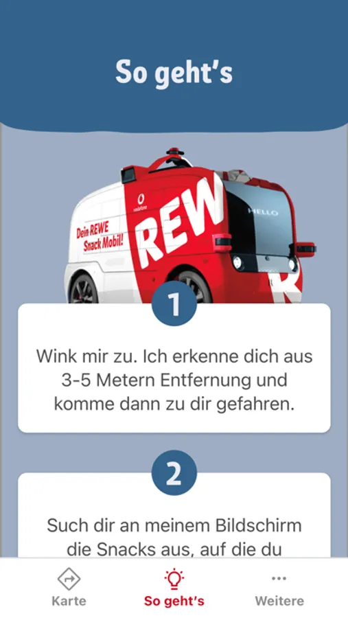 Wink dem Snack Mobil zu. Es erkennt dich auf 3-5 Metern Entfernung und kommt dann zu dir gefahren.