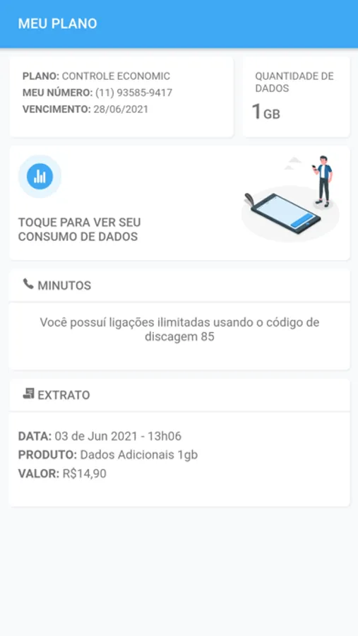Gerencie seu plano, consulte seu saldo, compre dados adicionais e muito mais.