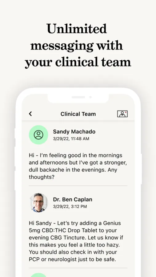 • Collaboration and iteration. We know that responsible cannabis care demands close patient-clinician partnership. We also know that any cannabis care regimen must evolve based on your input, changes to your body, how you live and an ever-changing product landscape.