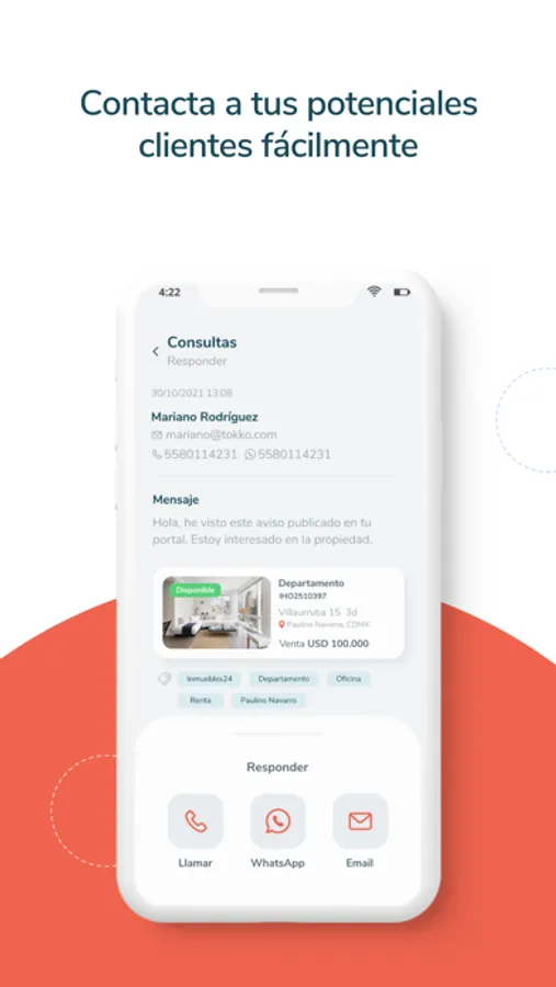 - Enviar fichas de la propiedad a tus prospectos por correo electrónico o WhatsApp desde la aplicación.