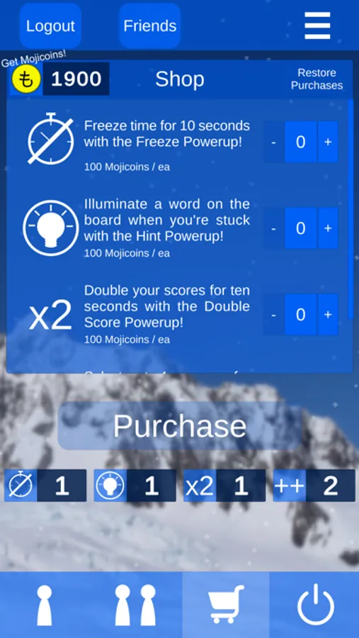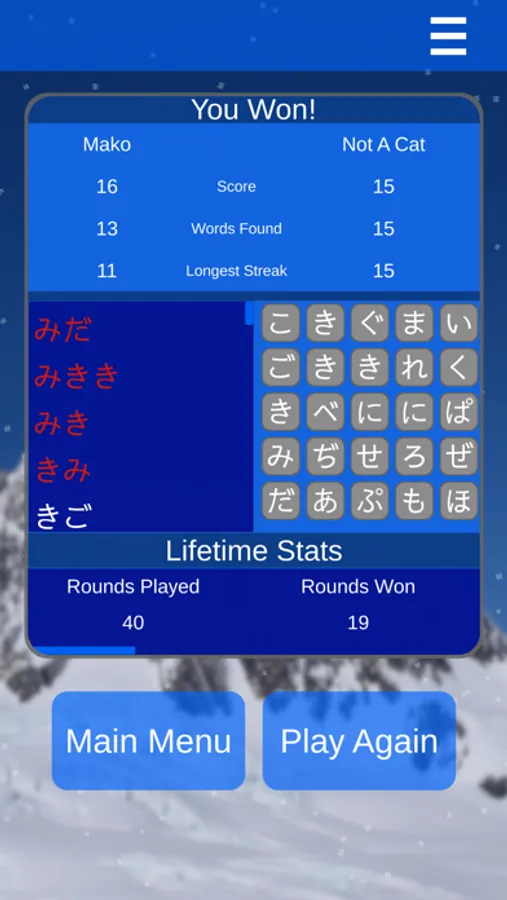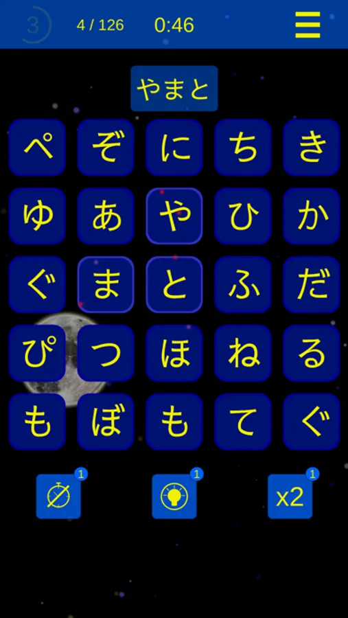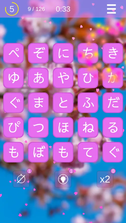 Challenge yourself to find as many Japanese words as you can in 60 seconds! Wield awesome powerups to pump up your score. Freeze pauses the timer for a few moments, Hint reveals a word for you, and the Double Score powerup gives you two times the points for each word found!