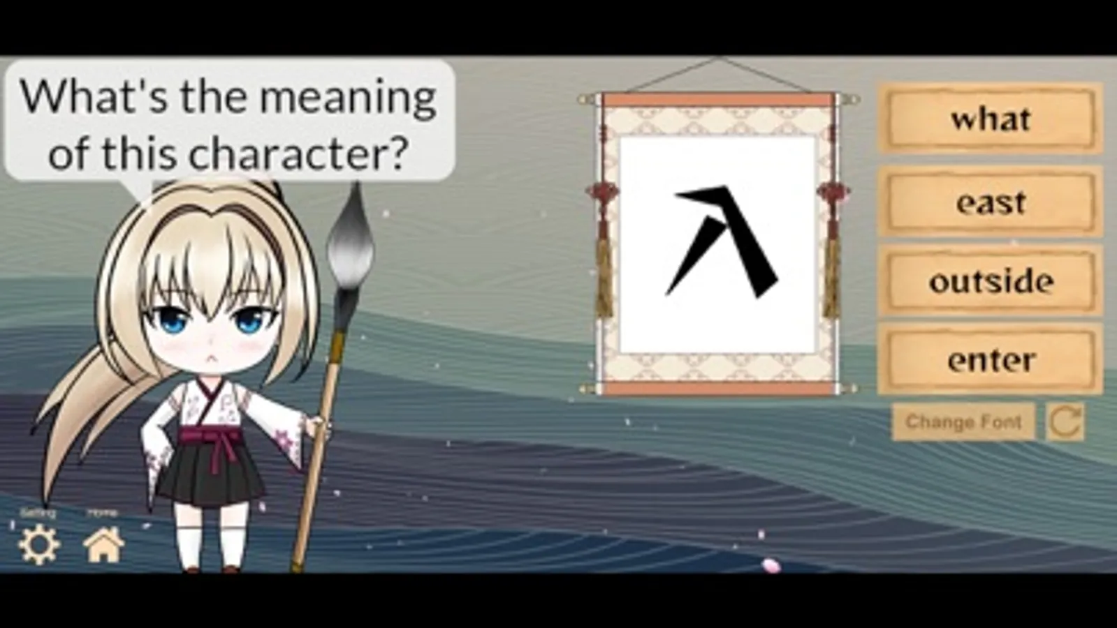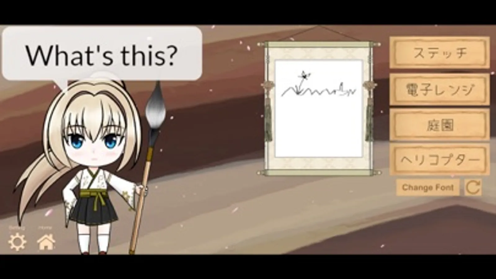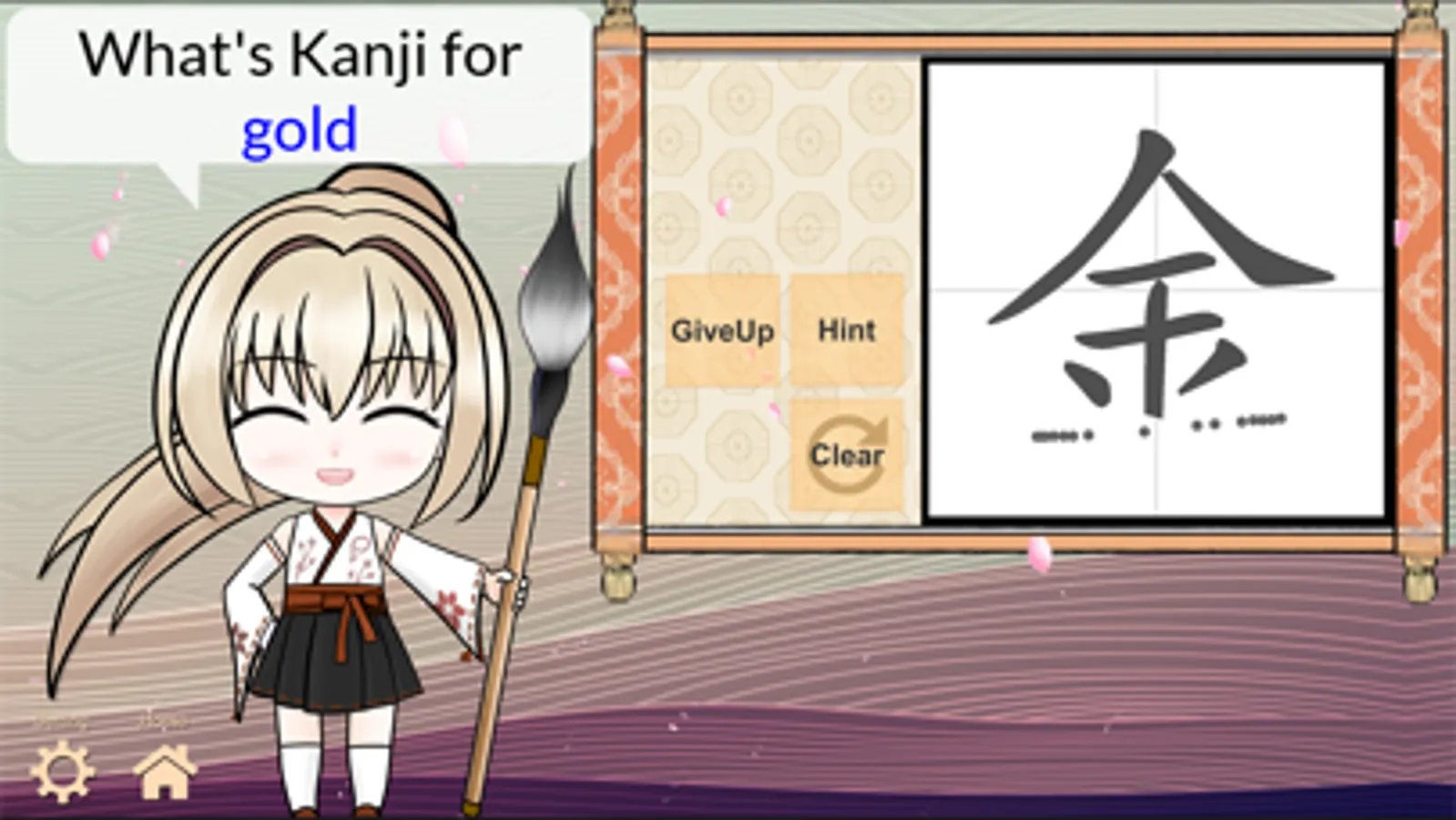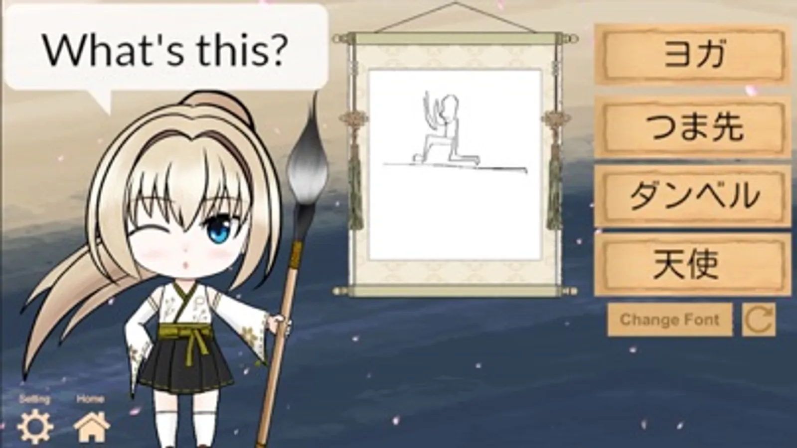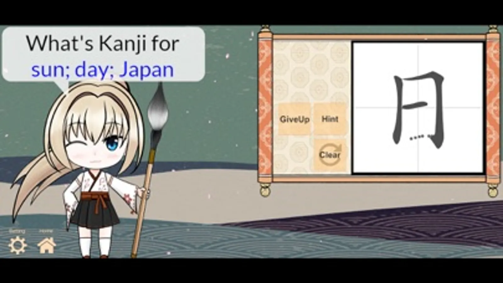 In each question, draw Kanji for given word(s). A score will be obtained if you can answer. Kotoba's emotion changes depending on on your performance.