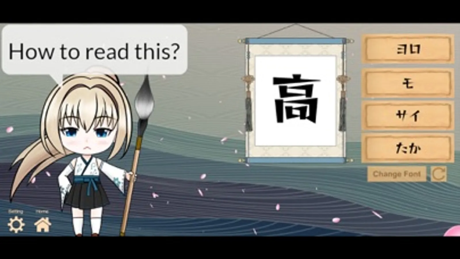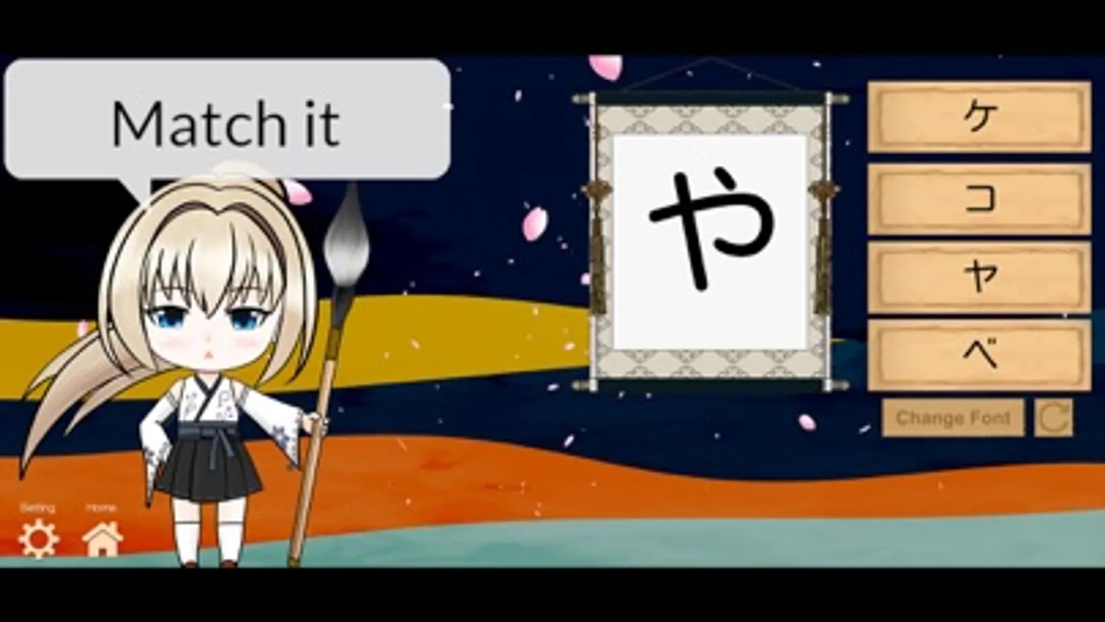 Learn Kana: Romanj-Kana: A Romanji is given, you pick a Kana