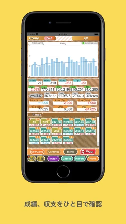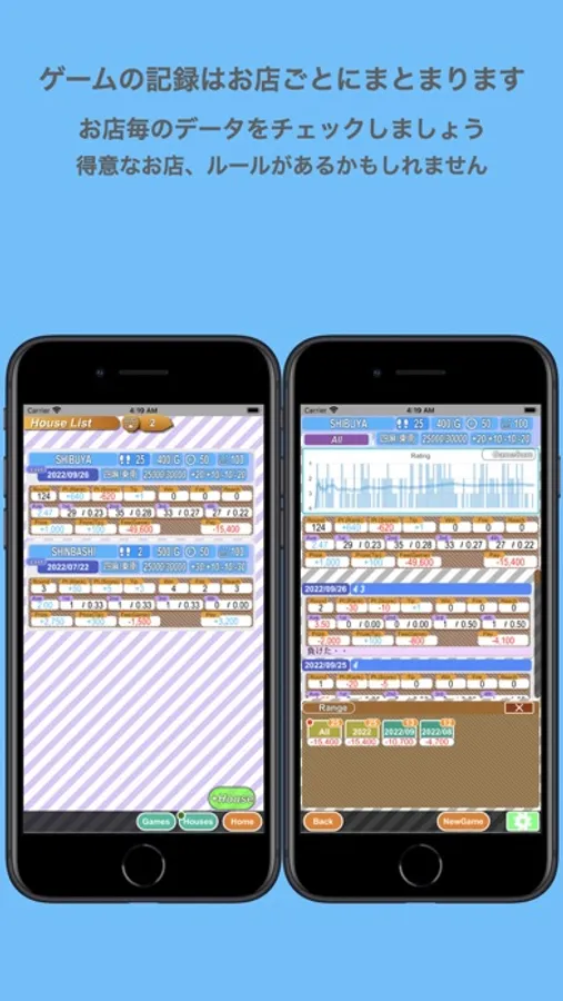 ・入力したデータから月間・年間のまとめ(範囲指定も可)、お店ごとの戦績が確認可能です。