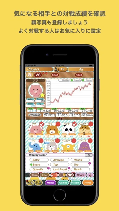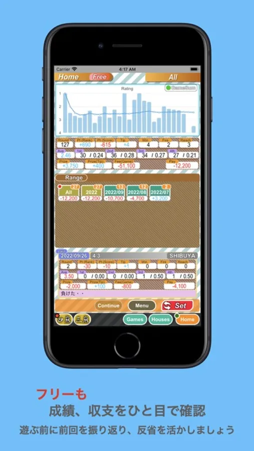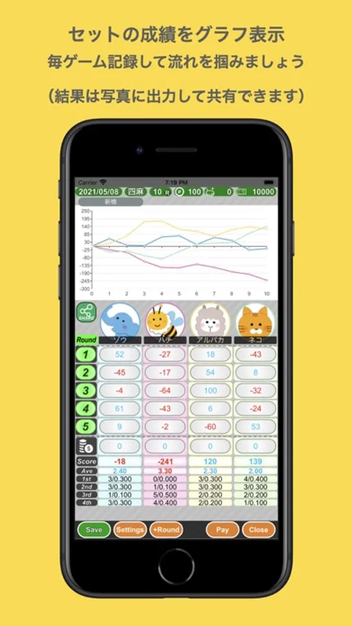 ・四人麻雀(4〜6人)、三人麻雀(3〜5人)のセットのデータ入力、保存が出来ます。グラフも表示されるので、スコアの変動が確認しやすくなっています。