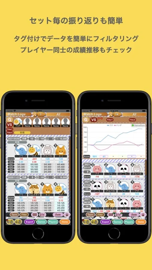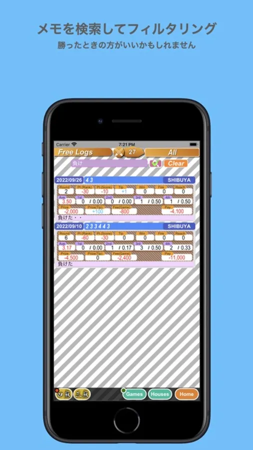 収支のまとめはもちろん、フィルタリング機能で記録の振り返り、成績の分析をお手伝いします。