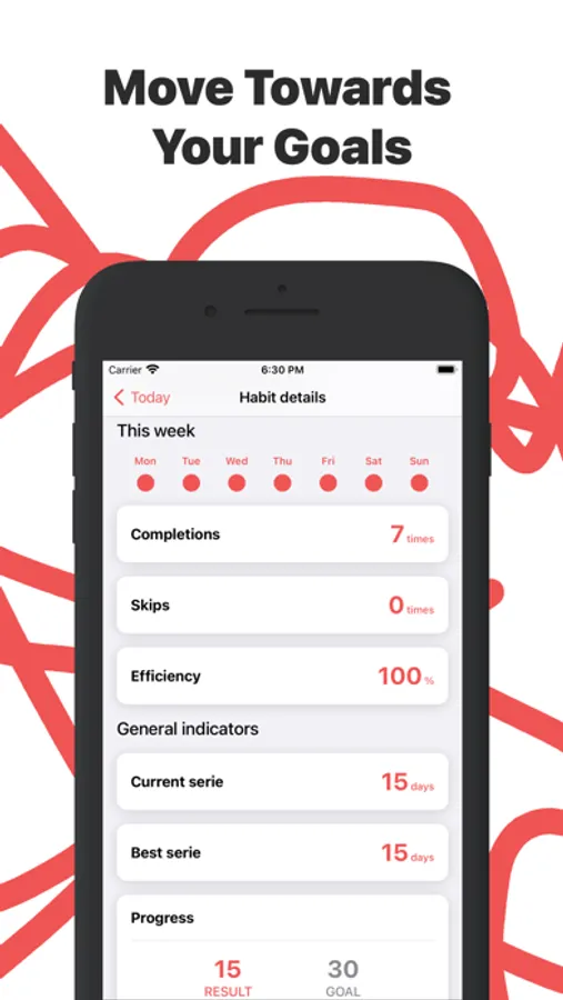 ◆ Individual statistics for each habit for the week (completion, misses, regularity and dynamics, progress towards the goal)