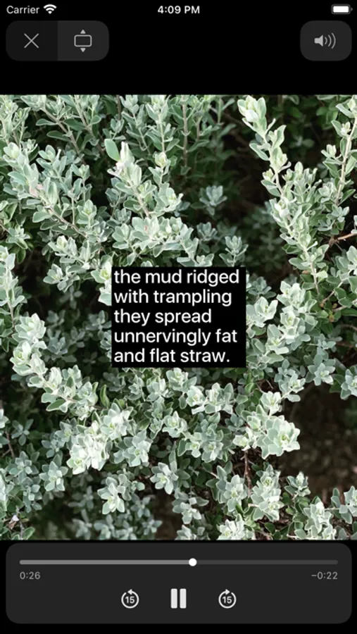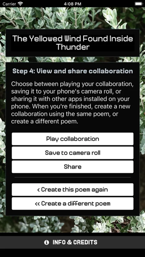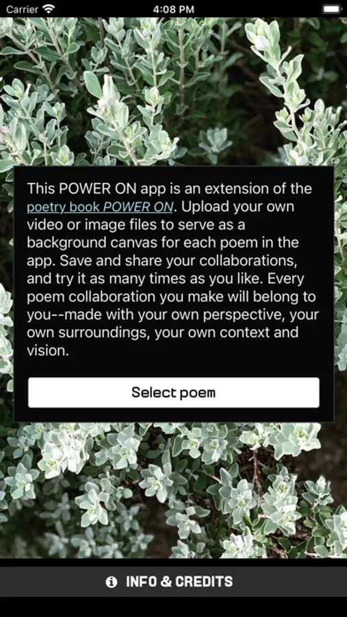 Upload your own video or image files to serve as a background canvas for each poem in the app. Save and share your collaborations, and try it as many times as you like. Every poem collaboration you make will belong to you--made with your own perspective, your own surroundings, your own context and vision.