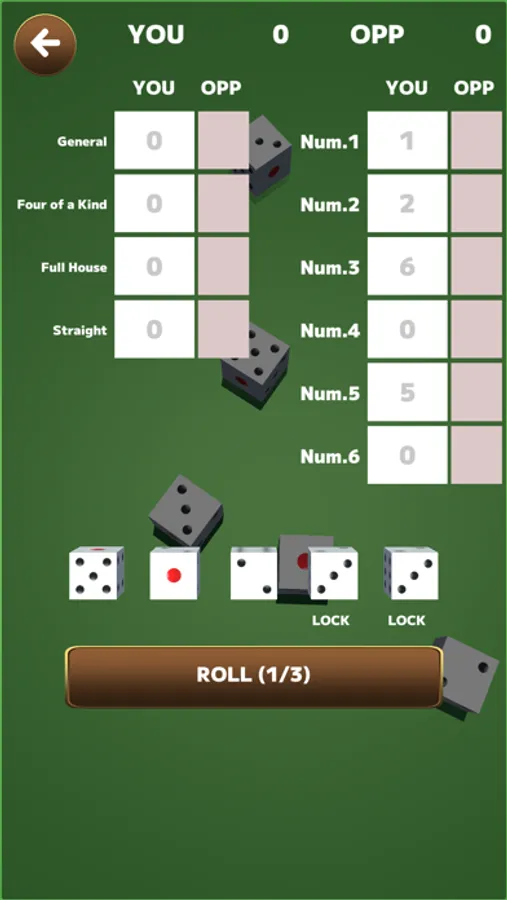 At the beginning of his turn, the player presses the "roll" button and rolls 5 dice.