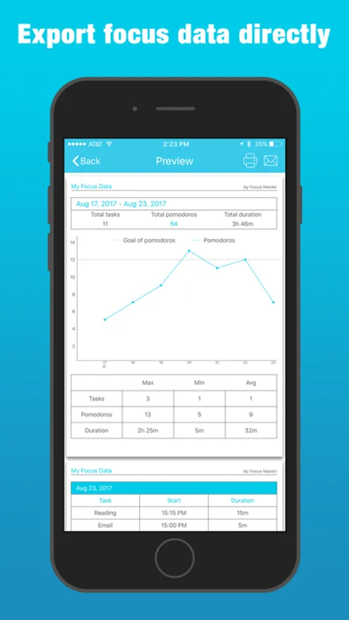 ⁃ Export pomodoro logs by email in format of PDF, HTML or CSV.