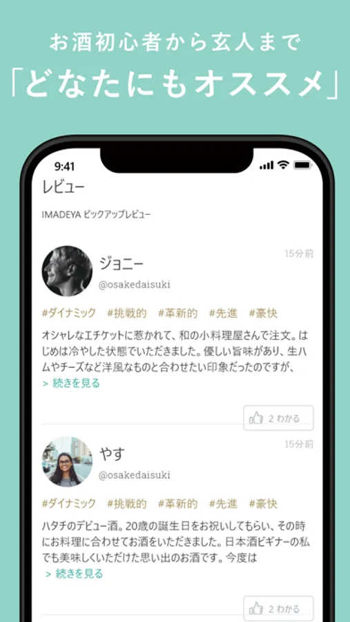 自分と似た感性のお酒好きのレビューを参考にお買い物ができるアプリです。約5,000種類以上の日本酒・ワイン・焼酎・ウィスキーなどを、いつでもどこでも楽しくお買い物。自分のお酒タイプを診断して、AIによるおすすめのお酒を購入したり、購入金額応じてIMADEYA ONLINE STOREや各店舗で使えるポイントを獲得!あなたもIMADEYAアプリを活用して、お酒をもっと身近にしませんか?