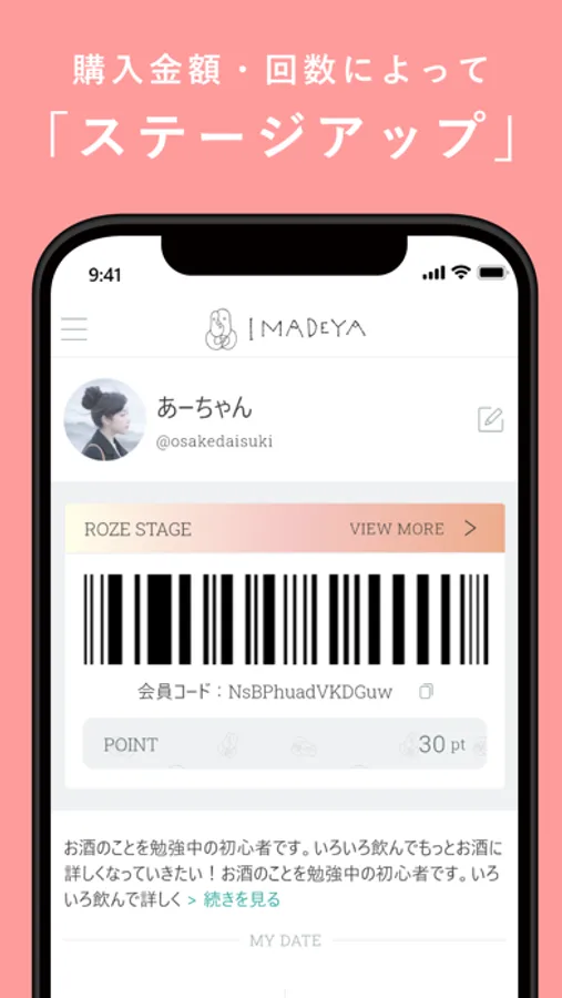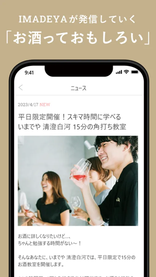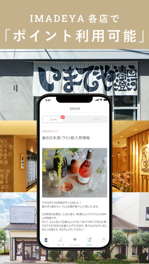 私たちは、 GINZA SIXなど首都圏で5店舗を運営するお酒のセレクトショップです。こちらのアプリでは、IMADEYAが国内外の生産者を直接訪問して取り扱いが始まった5,000種類以上の厳選されたお酒をご紹介しています。こちらは、そのIMADEYAの公式アプリです。
