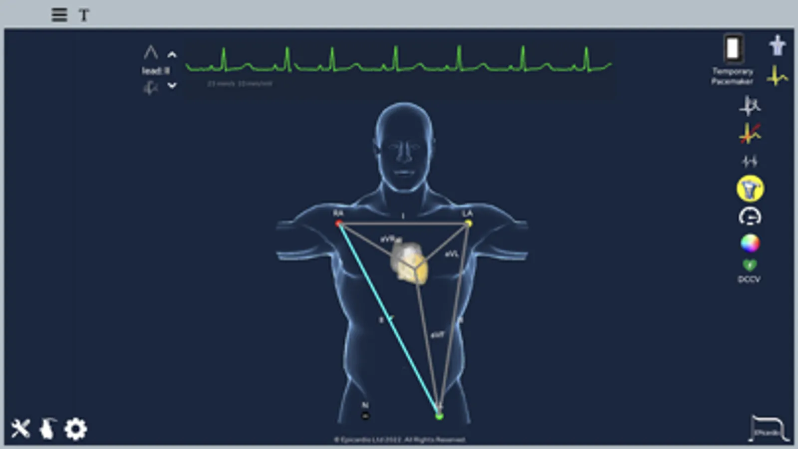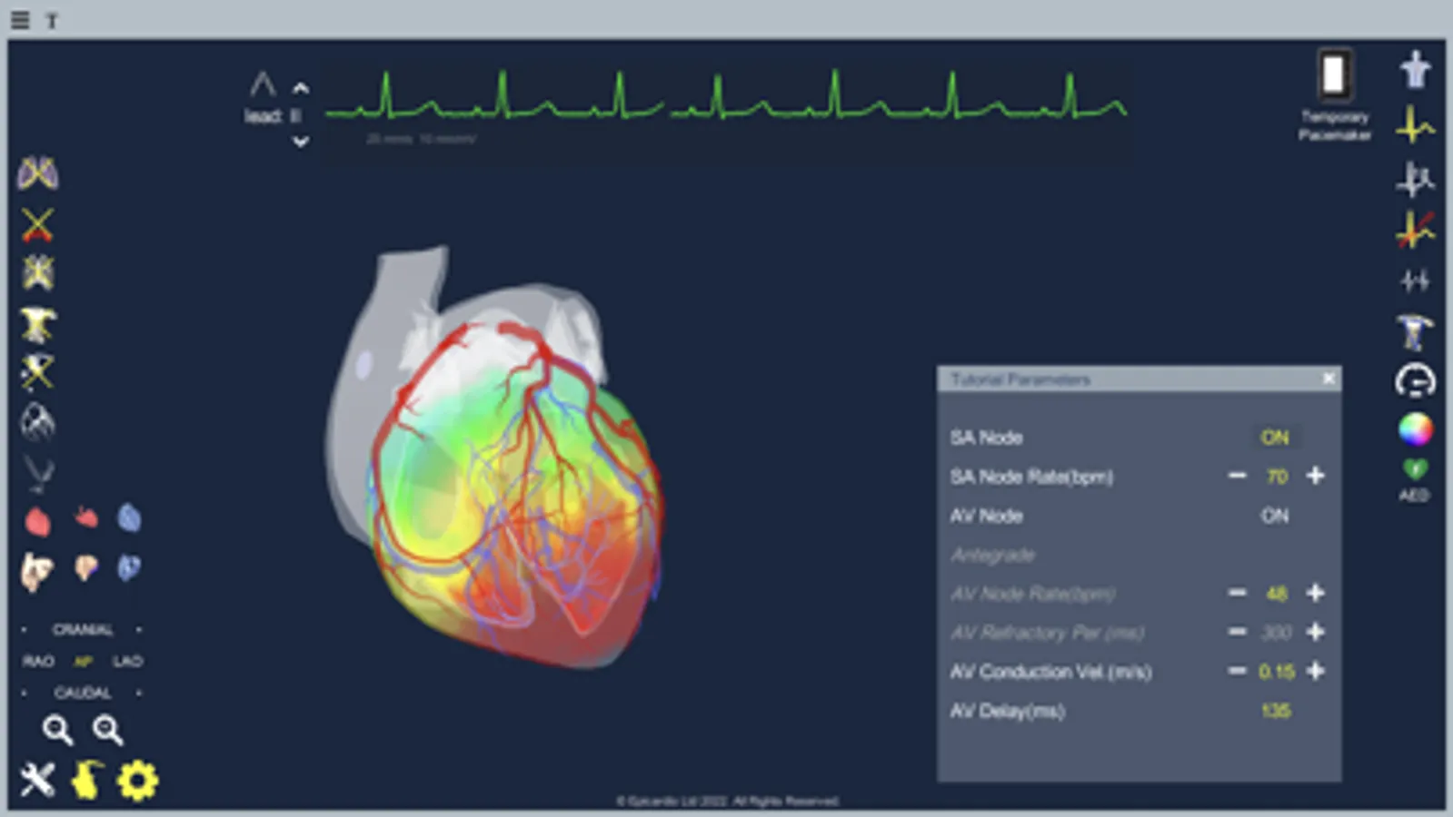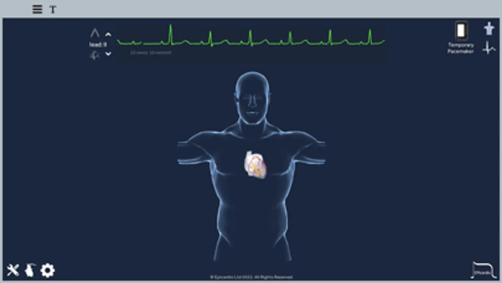 ECG is one of the most common diagnostics for Cardiology that all medical and nursing students are introduced at an early stage of their training. Confidence and experience gained from simulated training can help make first diagnosis successful and decrease risk to patients. This app uses real-time 3D anatomy and control of physiological parameters. Utilises electrophysiology simulation and live ECG signals to simulate the normal heart rhythm.