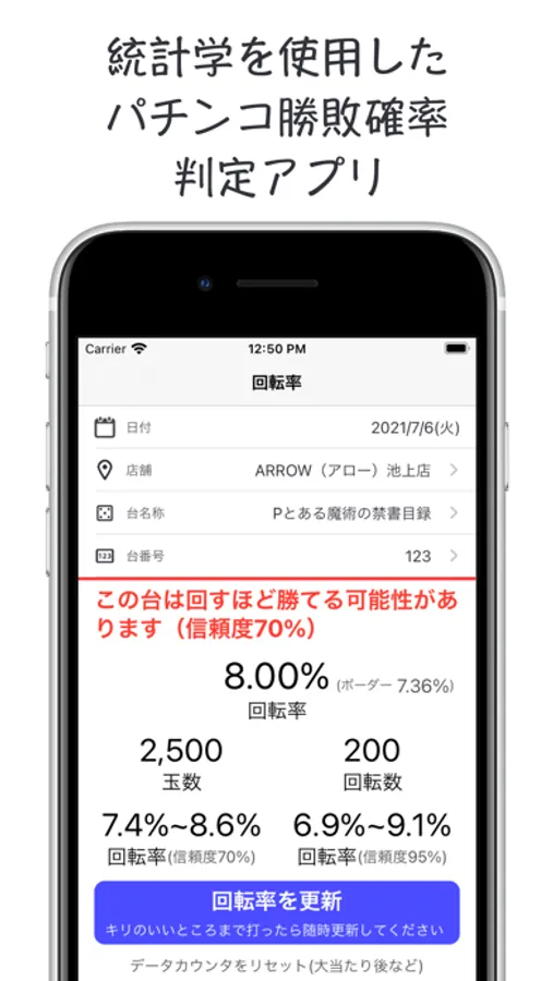 本アプリでは、パチンコ台の勝敗確率を統計学を使用して判定します。
