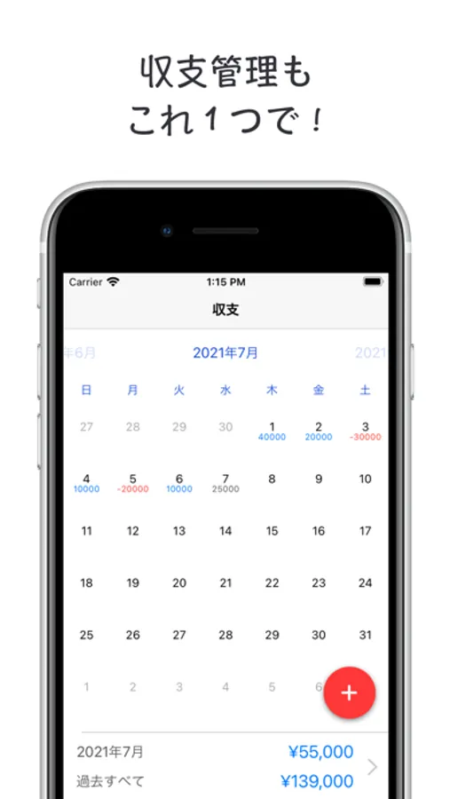 収支管理:収支の記録も本アプリ1つでできます。カレンダーを使用した見やすいインターフェースに、ただ予定を登録するだけのような分かりやすいデータ入力方法を用意しています。