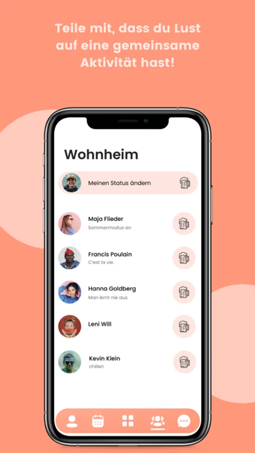 Du hast Lust auf einen kurzen Austausch, bei einem Bier oder Kaffee? Zeig es! Signalisiere über eins von 15 Statussymbolen, worauf du gerade Bock hast. Jeder sieht es in der Kontaktliste und kann mit dir im Chat vereinbaren, wo und wann ihr euch trefft.