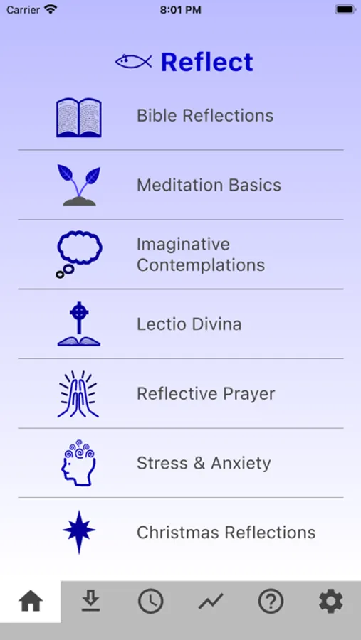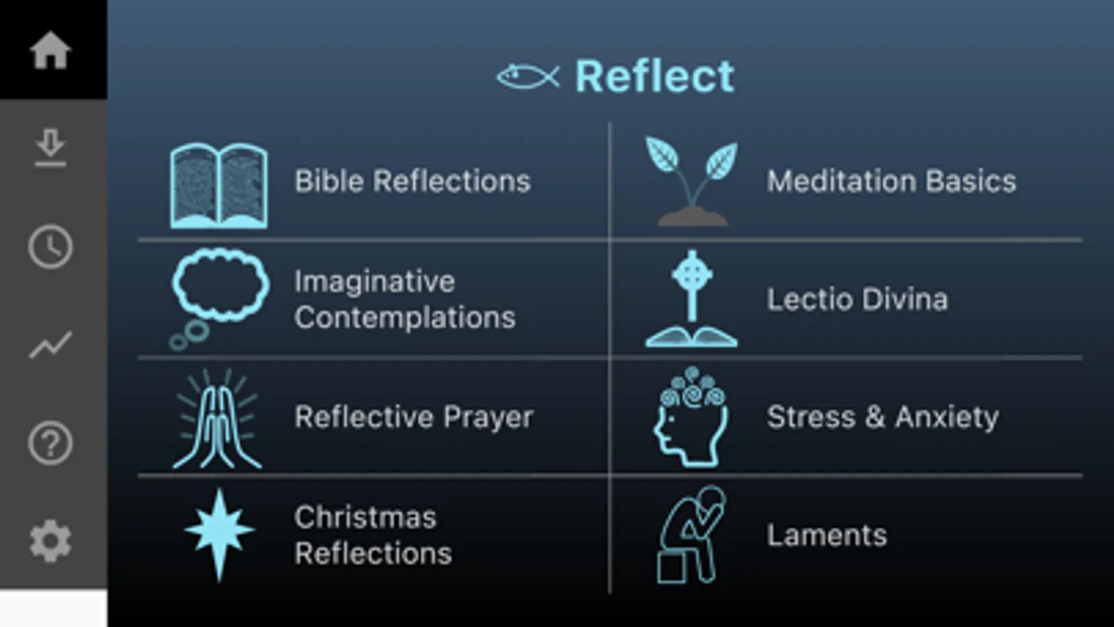 The sections of the app are: bible reflections - meditations on a passage from the bible, imaginative contemplation - place yourself in a scene from the bible, meditation basics - an introduction to mindfulness practices, reflective prayer - guided prayer exercises, lectio divina - meditations using reading a bible passage, stress and anxiety - bible reflections focussed on trusting in God, Christmas reflections - bible meditations on the Christmas story, and laments - bible reflections on difficult subjects.
