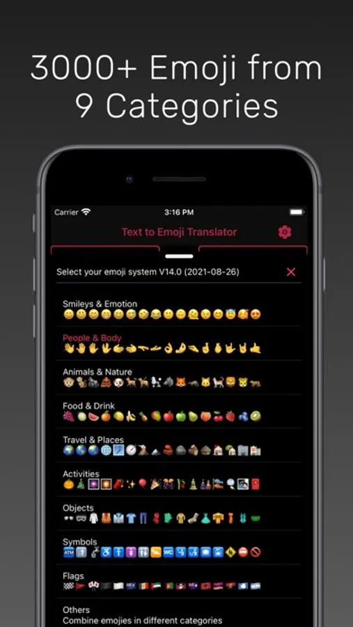 + Support 3000+ emoji from different categories: smileys & emotion, people & body, animals & nature, food & drink, travel & places, activities, objects, symbols, flags and more