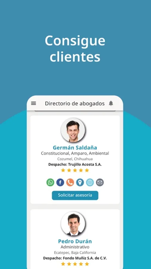 Con nuestro directorio podrán contactarte directamente por teléfono, WhatsApp o correo, sin necesidad de que el cliente se registre; o bien solicitarte una asesoría por medio de nuestra plataforma, para lo cual, de forma gratuita, te brindaremos sus datos de contacto para que lo conviertas en tu nuevo cliente.