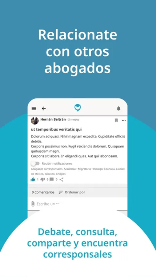 Realiza debates, solicita asesoría a otros colegas, o una segunda opinión, comparte información, noticias y documentos, y encuentra abogados corresponsales de todo México.