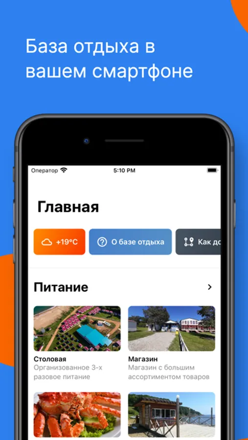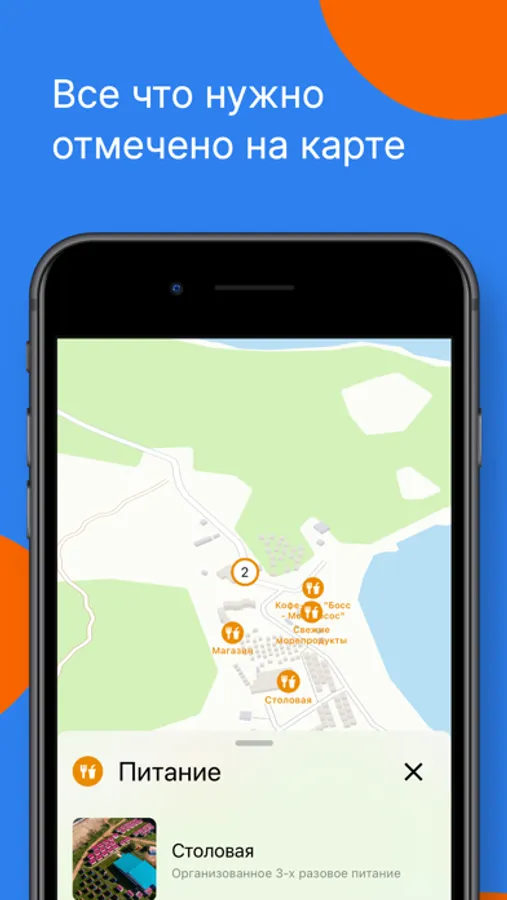 На территории базы отдыха и рядом работает большое количество заведений, где можно вкусно полноценно поесть или перекусить. Чтобы не упустить из виду не одно из них, а также не заблудиться, приложение позволяет увидеть их все, а также ознакомиться с подробной информацией о кафе и проложить до него маршрут.