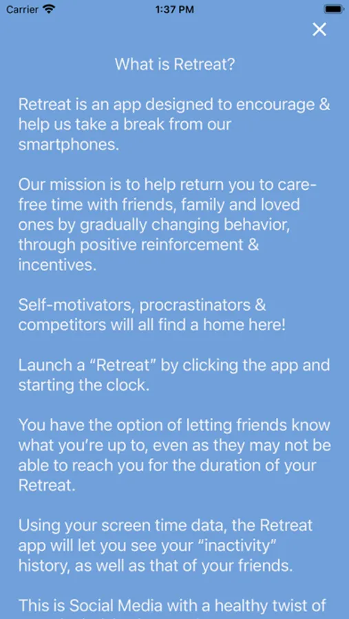 Retreat is an app designed to encourage & help us take a break from our smartphones. Our mission is to help return you to care-free time with friends, family and loved ones by gradually changing behavior, through positive reinforcement & incentives.
