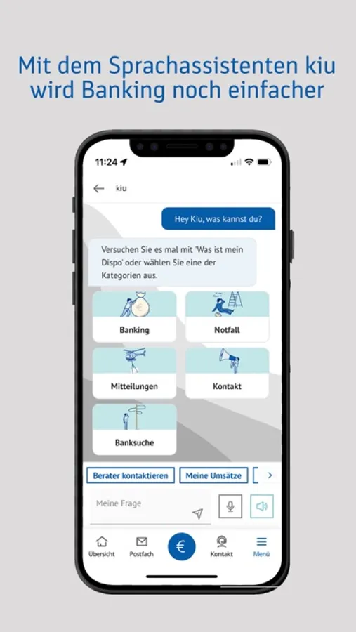 Die Kontostände kurz abhören oder eine Überweisung per Sprache aufgeben? Das alles ermöglicht der neue Sprachassistent kiu. Einfach per Sprache oder Tastatur die Frage eingeben und kiu hat die Lösung! Probieren Sie es einfach aus.