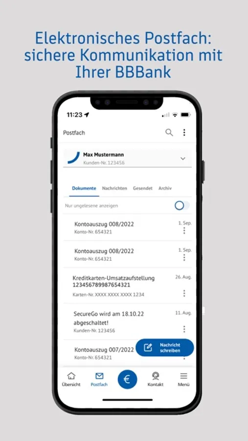 Die letzten Kontoauszüge oder Nachrichten des Beraters, alle direkt in der App über das Postfach abrufbar. Die Kommunikation erfolgt im Hintergrund sicher und verschlüsselt.