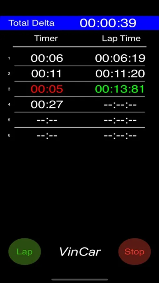 Im oberen Balken wird die gesamte Abweichung zu den Sollzeiten angezeigt. Durch horizontales Wischen über die gestoppten Zeiten werden die Abweichungen der einzelnen Runden angezeigt.
