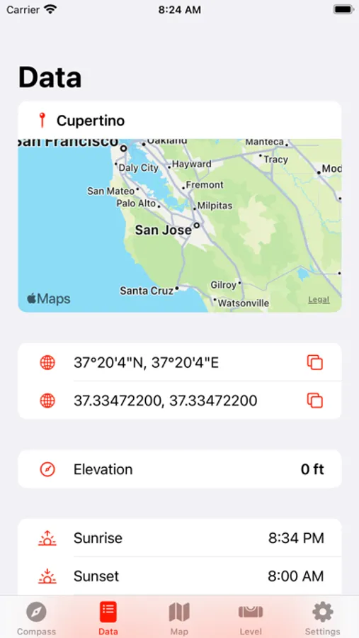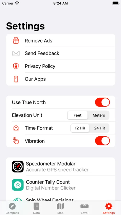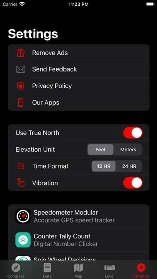 App has various compass designs. Furthermore, location information, height and sunset/sunrise times can be shown on the screen. Flashlight can be turned on/off from the application as well.