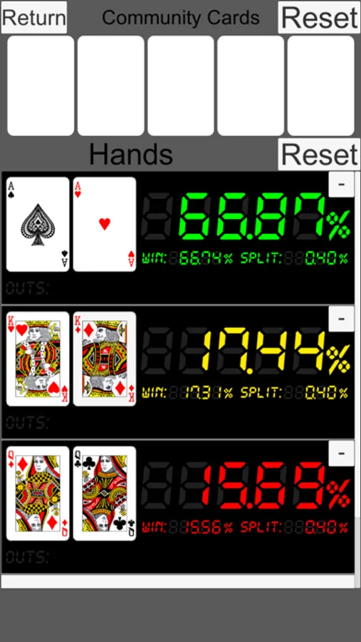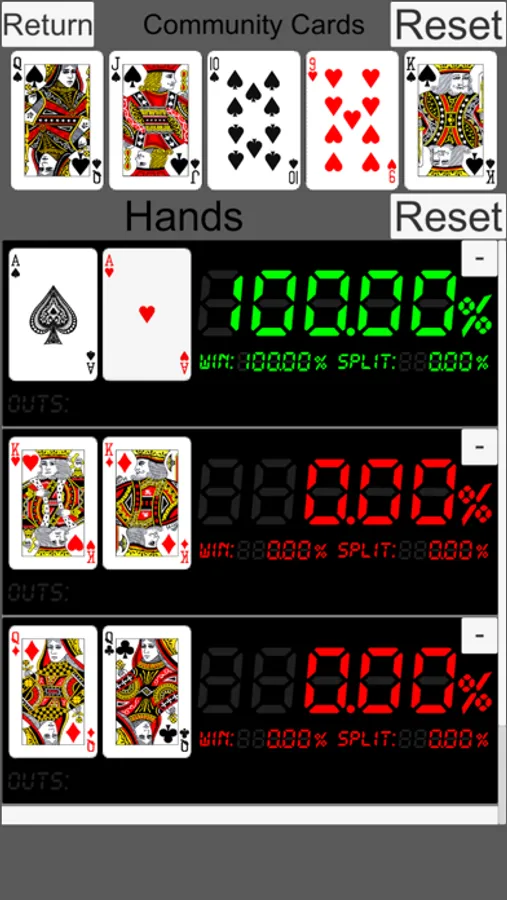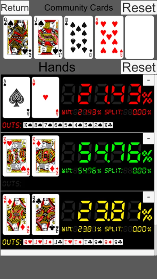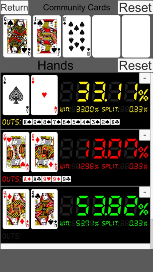 Equity and outs are calculated and displayed from cards.