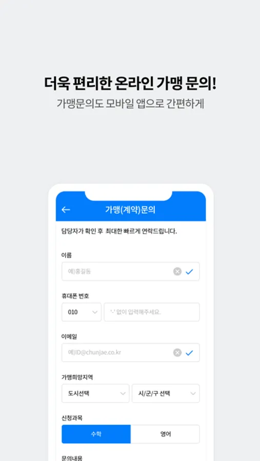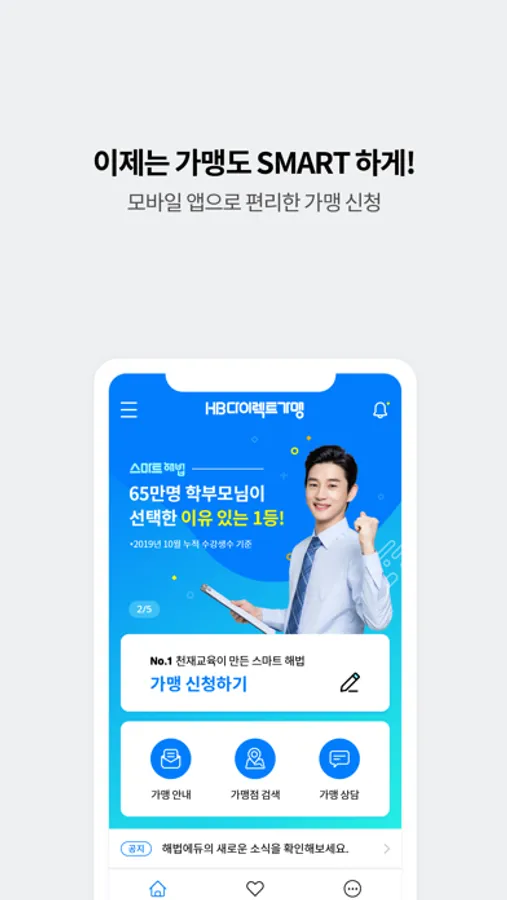 No.1 교육 프랜차이즈 스마트해법수학과 스마트해법영어를 복잡한 가맹 절차 없이 모바일로 계약이 가능합니다.