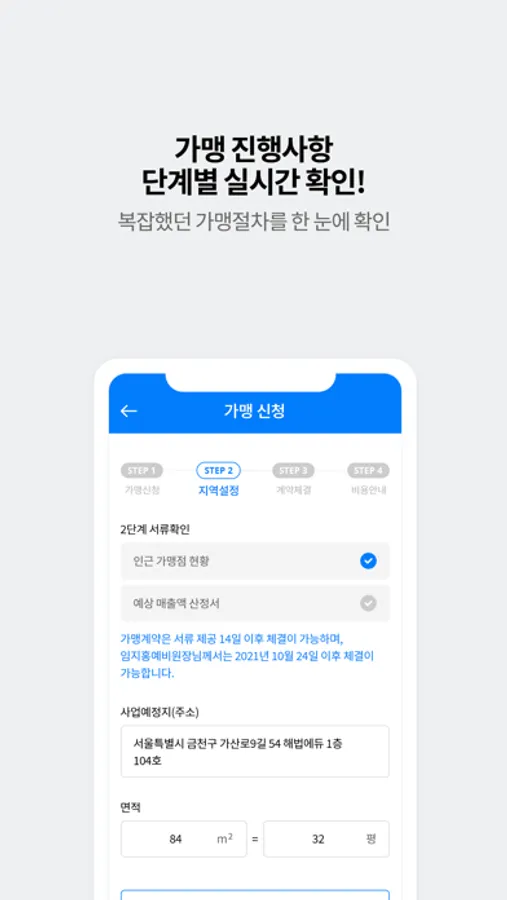 가맹 계약 시 필요한 계약서, 정보공개서 확인부터 인근가맹점현황문서, 예상매출액산정서 까지 모바일로 가맹신청만하면 확인이 가능하며, 계약 진행사항을 단계별로 실시간 확인이 가능합니다.