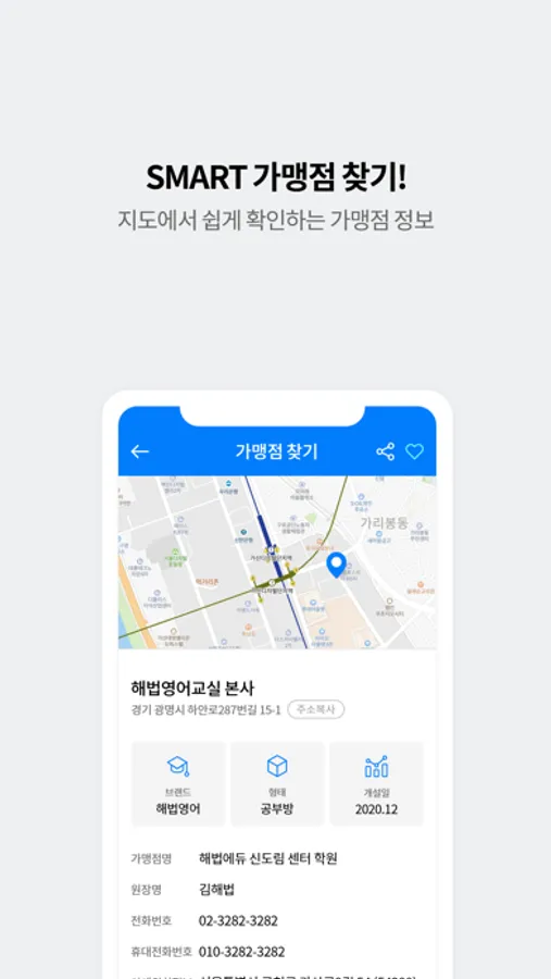 위치기반서비스를 통해 가맹하고자하는 위치의 학교 및 현재 운영 중인 가맹점 정보를 확인할 수 있고, 해법 가맹점 전체 위치정보를 볼 수 있어 자녀 교육을 고민하고 계시는 학부모님들께서도 No.1 프랜차이즈 해법에듀의 가맹점 정보를 확인할 수 있습니다.