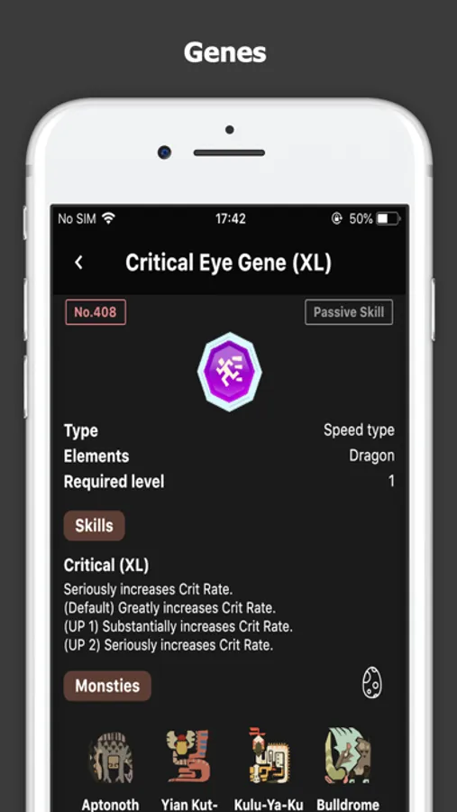 「Gene info」- Shows the gene info, related genes and monsters carried.