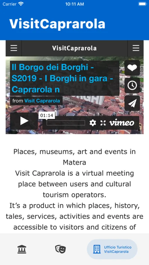 L'app VisitCaprarola offre all'utente tutte le informazioni per vivere al meglio la città di Caprarola: informazioni su Eventi in programmazione e Avvisi del comune.