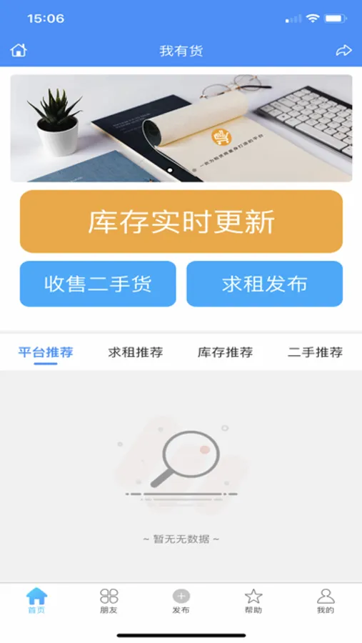 我有货app平台是一款免费服务于兰州地区的建材物资租赁展示平台,主要分为三大版块,分别为:库存实时更新,收售二手货,求租发布。