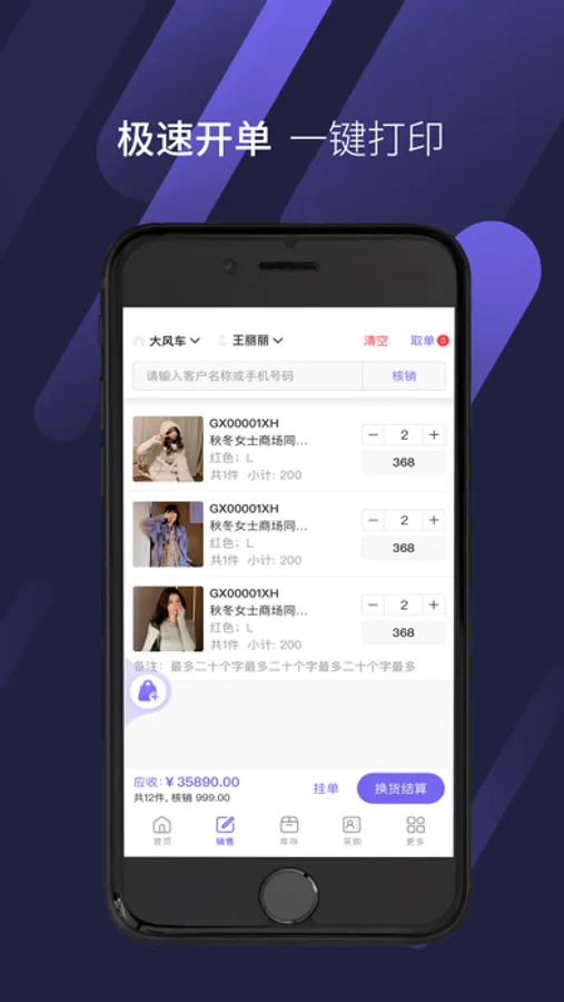 适用于服装零售门店,随时随地手机开单、记账、管客户、管库存、管店铺!